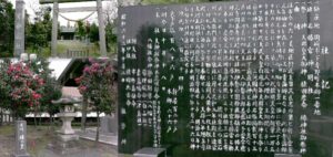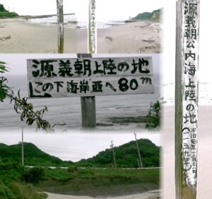 源義朝:頼朝・義経公父子の史跡を訪ねて(愛知、その2) 源義朝公・内海上陸の地。左上段の写真(海岸砂浜に立つ)。左中段は国道247号線脇に立つ。 左下段は内海上陸の地から「義朝公の大岩」方面の山(右)を撮る。上段の地図参照で義朝公休憩 の