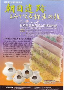 上小田井駅周辺案内(その3、朝日遺跡特集) 「朝日遺跡よみがえる弥生の技」。 リンク:東海地方屈指の大集落『愛知県清洲貝殻山貝塚資料館』。 弥生の森に建つ弥生式住居。 弥生式住居の内部(左)と萱で作られた屋根。 館内展示品 館内