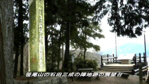 秀吉公尾張中村から京都~大阪城まで(その7,関が原合戦特集) 石田三成陣地跡。 関が原大合戦説明板。 国史跡・石田三成陣地。 21号線沿い桃配山(ももくばりやま)の徳川家康最初の陣地入り口と陣地から北:笹尾山に連なる山々を写す。