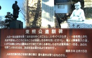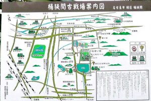 信長誕生から岐阜城まで(その3) 「戦評の松」前の案内板。 上段の案内板右下の説明文拡大。 「戦評の松」のポケットパーク。 桶狭間古戦場公園内の銅像。右:今川義元公(42歳)。左:織田信長公(27歳)。 桶狭間古戦場公園説明文拡大