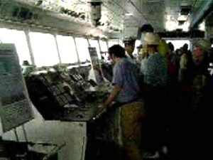 地球深部探査船「ちきゅう」乗船見学会(第1部) 地球深部探査船「ちきゅう」のブリッジ。 浮かぶ石油化学プラントの感じ。 世界の研究者、技術者など150名が居住する浮かぶ研究所でもある 資料:長さ210メートル 幅38メートル 深さ16