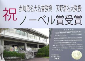 名古屋大学駅周辺案内(その2、ノーベル賞受賞・開通記念号) The Nagoya University station circumference guidance(no.2) 古川記念館と玄関横に掲げられた祝・ノーベル賞受賞の掲示。2