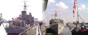 名古屋港駅特集(海上自衛隊掃海艦見学) 平成16年1月24日ガーデン埠頭 左「つしま」、右「やえやま」、左端の三角ボタンを押せば繰り返しご覧できます。 海上自衛隊掃海艦「つしま」「やえやま」2艦の名古屋港訪問で見学しました(1月24日