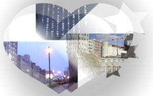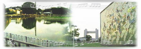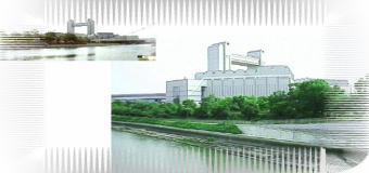 錦橋付近の昼と夕暮れ、広井天王崎祭禮巻き藁船の行列(2枚とも)写真上は名古屋市国際会議場,熱田神宮公園下の堀川東岸より望む左の森は白鳥公園、写真下は名城線西高蔵駅西の旗屋橋から見る。