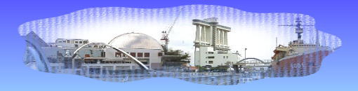 南極観測船「ふじ」と名古屋港のシンボルで帆船をイメージしたポートタワー(名古屋海洋博物館)と名古屋港水族館(左)