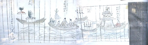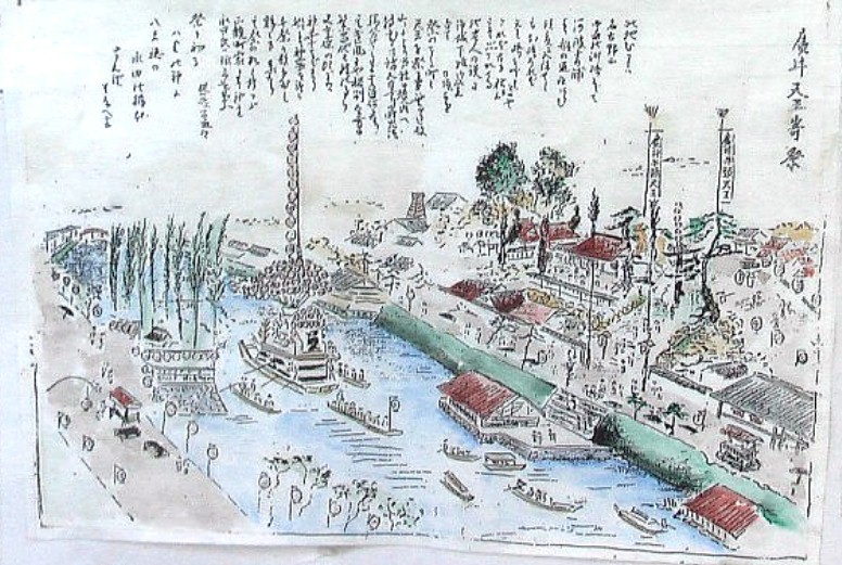 左は当時の洲崎神社(対岸の森の中)と祭礼の御輿
