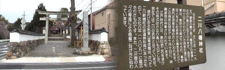 左:JR二川駅、右:本陣横の高札場復元立場茶屋跡と町並み。西問屋場跡と町並み。右は飯村(いむれ)一里塚跡(旧道と国道1号線の合流点にある)、左写真はマックの駐車場から南(殿田橋)方面旧東海道を見る。