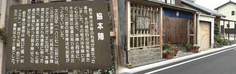 二川宿本陣と内部の展示品。東問屋場跡付近の町並み。高札場跡と町並み。年貢米、非常用食料などの倉庫の跡。