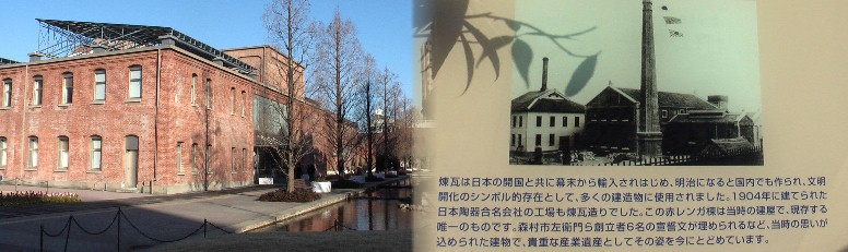 上は園内から見るjr名古屋駅方面と旧煙突の現在。下は窯壁とよばれ工場解体時に土の中からよみがえった煉瓦通路。
