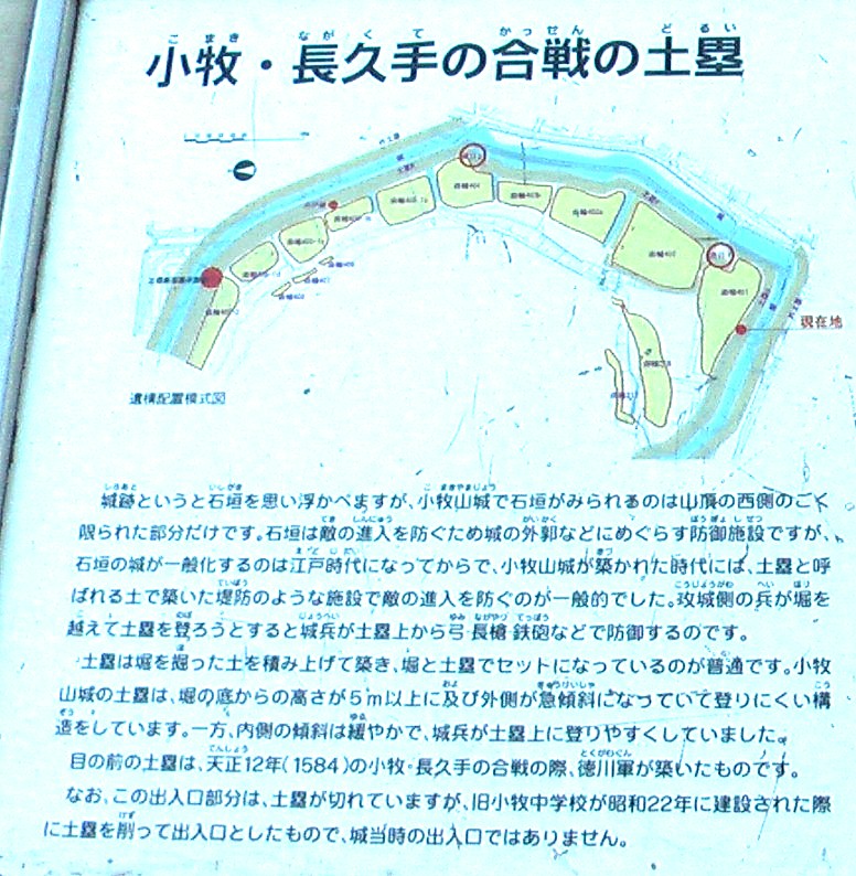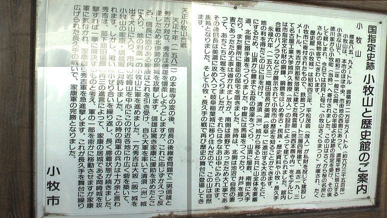 解説板の一部を紹介します。東面から見る小牧城と解説板。小牧山頂、木々の間から撮影。