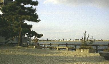 無論逆のコースも利用されていました。史跡から望む長良川河口堰平成9年10月25日撮影松林に囲まれた小山が辰巳櫓跡である。