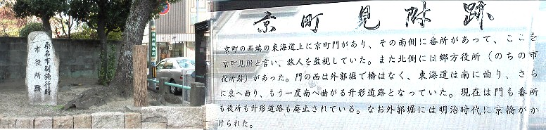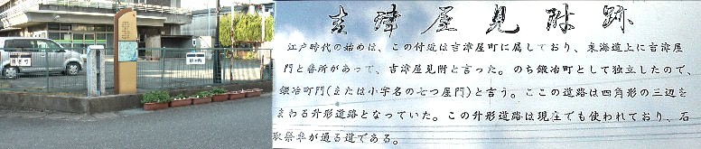 矢田立場から東進してきた街道はここで左折して吉津屋見附跡方面に行く。枡形道路の一角にあるお店と標識左に三条大橋の欄干が見えます。
