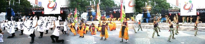 第二回にっぽんど真ん中祭り(その2)はじめは数人の学生の想いだった。踊る楽しさ、祭りの熱狂、感動や情熱を胸に北海道YOSAKOIソーラン祭りから帰って来た。こんなおまつりを自分たちの住む街でもやりたいと1999年2月名古屋に新しい祭りが誕生した久屋メーン会場、広小路パレード会場大須観音会場、大須パレード会場、金山会場の5会場を踊る人達があちこっち移動しながら町全体をまつりモードにしてしまおうという、文字通りの「ど真ん中まつり」だがや!!
