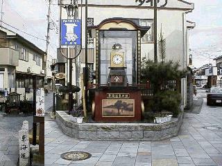 近江鉄道の駅前に左下のような小さな東海道の石碑があった。その先に写真のような東海道水口宿の銘板をはめ込んだ豪華な台に時計を収めた神社風屋根のガラスケースが一際目立った。ここで道が三本に分かれて、先で一本になって土山宿へ行くとのことでした。