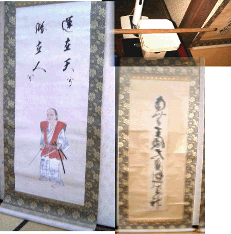 笠寺・東光院 笠寺東光院の許可を得て撮影したものです。 宮本武蔵遺品は現在一般公開されていません。 宮本武蔵肖像画「東光院蔵」。肖像画には抜身の刀を二本下段に構えたポーズに 「運は天にあり勝ちは人にあり」と読み武蔵の生きかたを述べたものと思