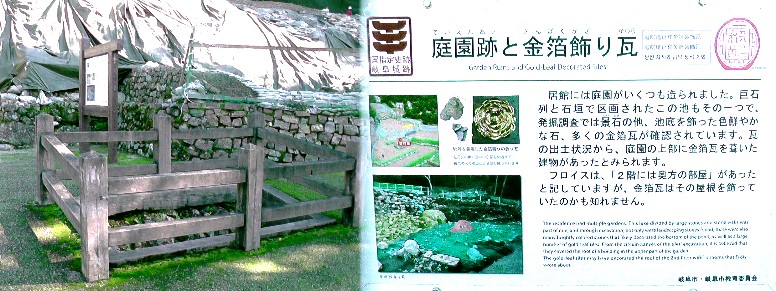 織田信長公居館跡信長公以前の居館。発掘中の文字が見える居館跡。水路と石垣。写真右に石碑が建っています。「平成の滝」と彫られています。