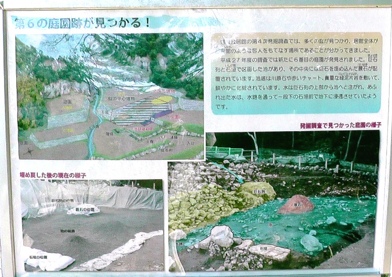 冠木門前に造られた物見櫓。居館入り口の案内板から三重の塔を撮る。居館の基盤・石垣の構造。