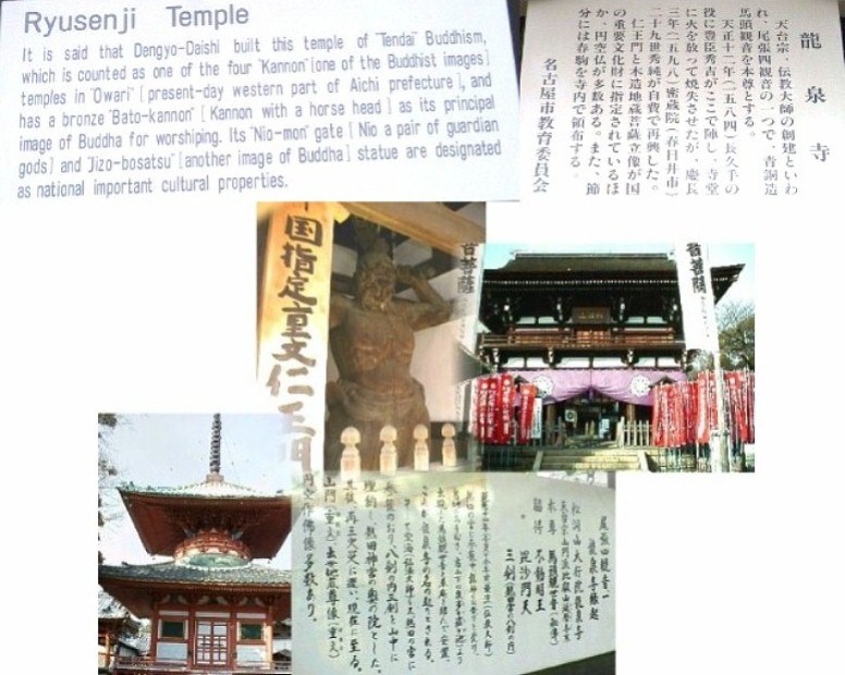 龍泉寺本堂と二重塔。ここにはかって龍泉寺城がありました。山門横にある馬頭観音菩薩像。