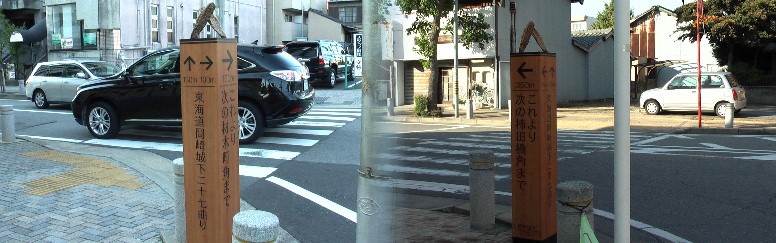 右は大平一里塚の北側跡地に立つ常夜灯、左は岡崎宿入り口付近