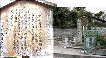 右は津島一里塚,現在ではここと亀山のとが残っているのみです。代官所前にある船着き場への案内石碑(元は佐屋の旧家にあったものが寄付され移転されたもの。)佐屋街道には桑名へ渡る船着き場はこの他にもいくつかあった。石碑の後ろの林はキコク(カラタチの別名)の生け垣で当時のままの姿である。下の尾張名所図絵にも紹介されている。