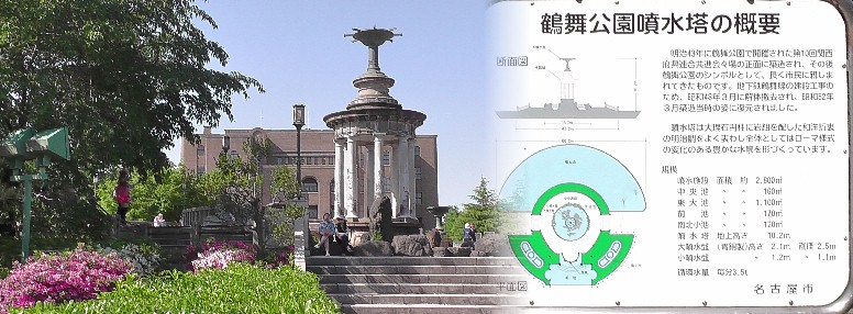 胡蝶ケ池1。胡蝶ケ池2鈴菜橋。明治43年に作られた胡蝶ケ池、背景の建物は名古屋大学付属病院左噴水塔は明治43年に造られ,鶴舞公園のシンボルとなっている。ローマ様式の大理石柱に岩場の組み合わせという和洋折衷である。その右は市公会堂、焼け残った貴重な戦前の建物(都市景観重要建築物)。その右は奏楽堂で明治43年に造られ美しく整備された名古屋一の公園です。