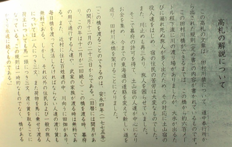 東海道五十三次、土山宿(滋賀県)の旅(その4)広重、土山、春之雨広重画検証:この場所から描いたものです。向うの森は田村神社、田村川に架かる海道橋田村神社前にあります。田村川橋に関する高札場跡(下記写真)昔、田村川には鮎が遡上して群れを成して泳いでいたものと思われます。今はどうでしょうか俳人井上士朗は名古屋市守山区の出身で今も東区大光寺横に宅跡があります。